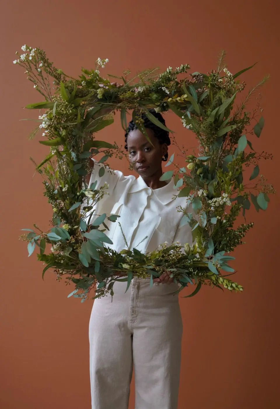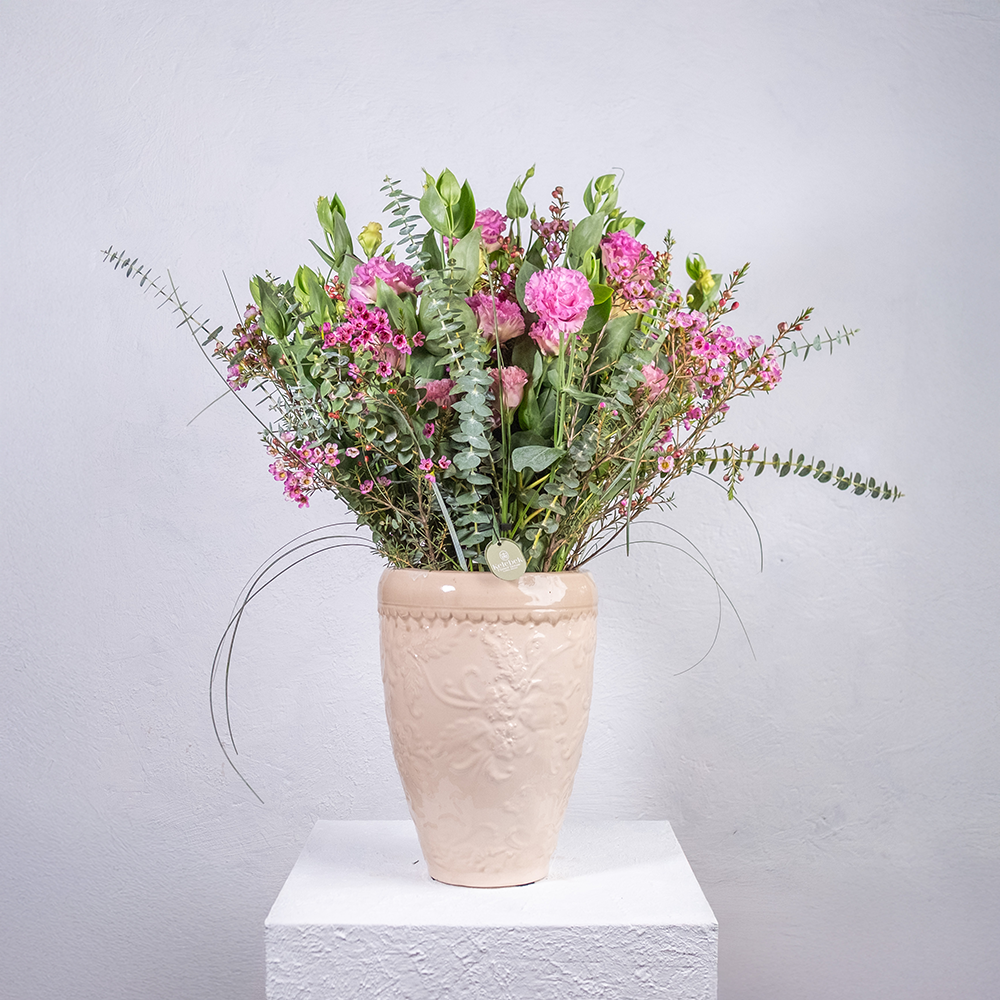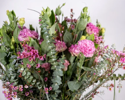 Seramik Vazo İçerisinde Pembe Lisyantus, Okaliptus Dallarından Oluşan Aranjman