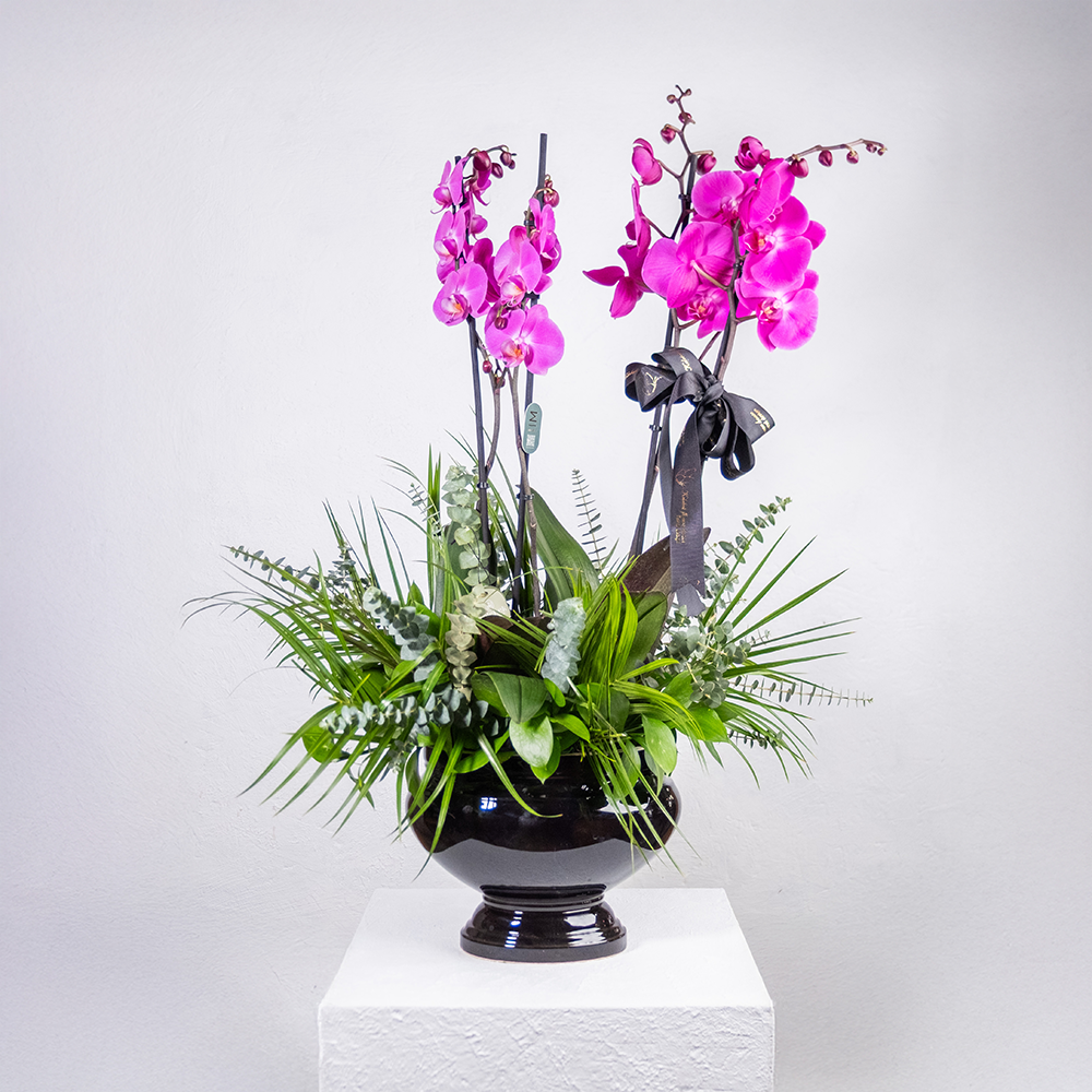 Siyah Renk Seramik Obje İçerisinde 4 Dal Mor Orkide