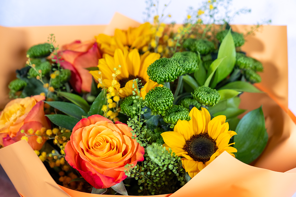 Ayçiçeği, Turuncu Gül, Yeşil Krizantemlerden Oluşan Buket
